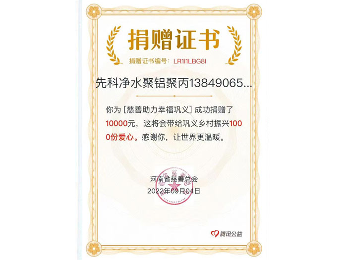 鞏義市先科凈水材料廠20多年來始終以凈化水源,造福人類為己任,2011年收購鞏義市興龍凈水材料廠投資4000萬建設導熱油鍋爐生產線2條,噴霧干燥塔2座成為目前國內外較大的無機凈水材料生產企業。有職工50余名,年產各種凈水材料5萬噸,產值上億。本企業生產的主要產品有聚合氯化鋁,聚氯化鋁,聚合硫酸鐵,堿式氯化鋁,聚丙烯酰胺(陰,陽,非離子)……